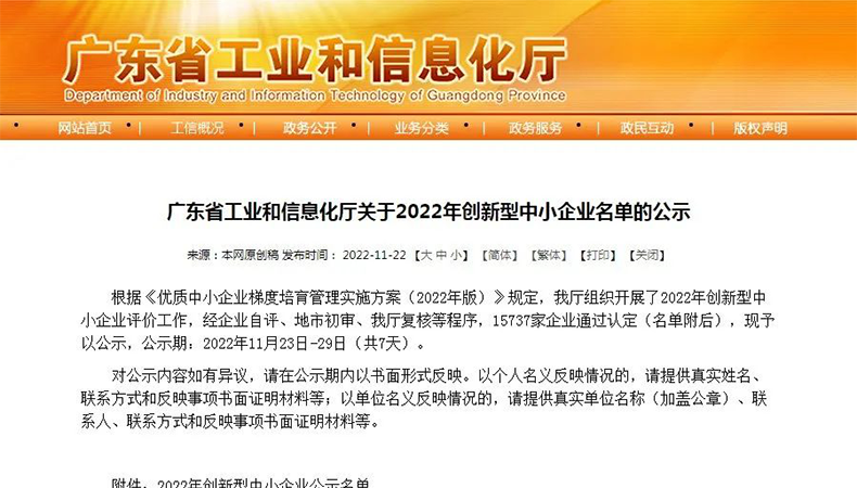 榮冠公司榮獲廣東省“2022年創新型中小企業”認定!
